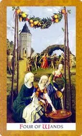 En el tarot Rider-Waite, el Cuatro de Bastos representa la salida de una “ciudad amurallada” hacia un campo abierto, simbolizando la transición de una postura defensiva a una abierta y optimista. Cuando la carta aparece invertida, este proceso de apertura se ve interrumpido.